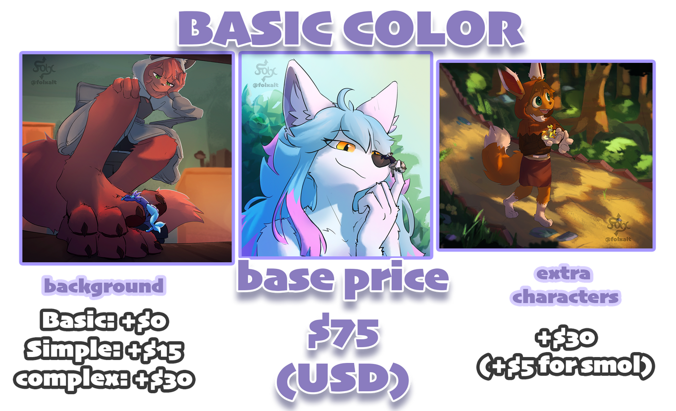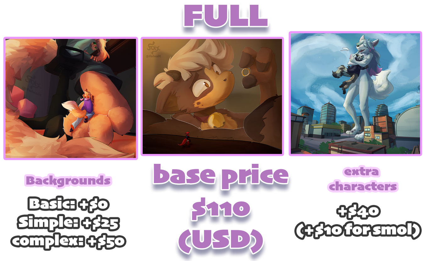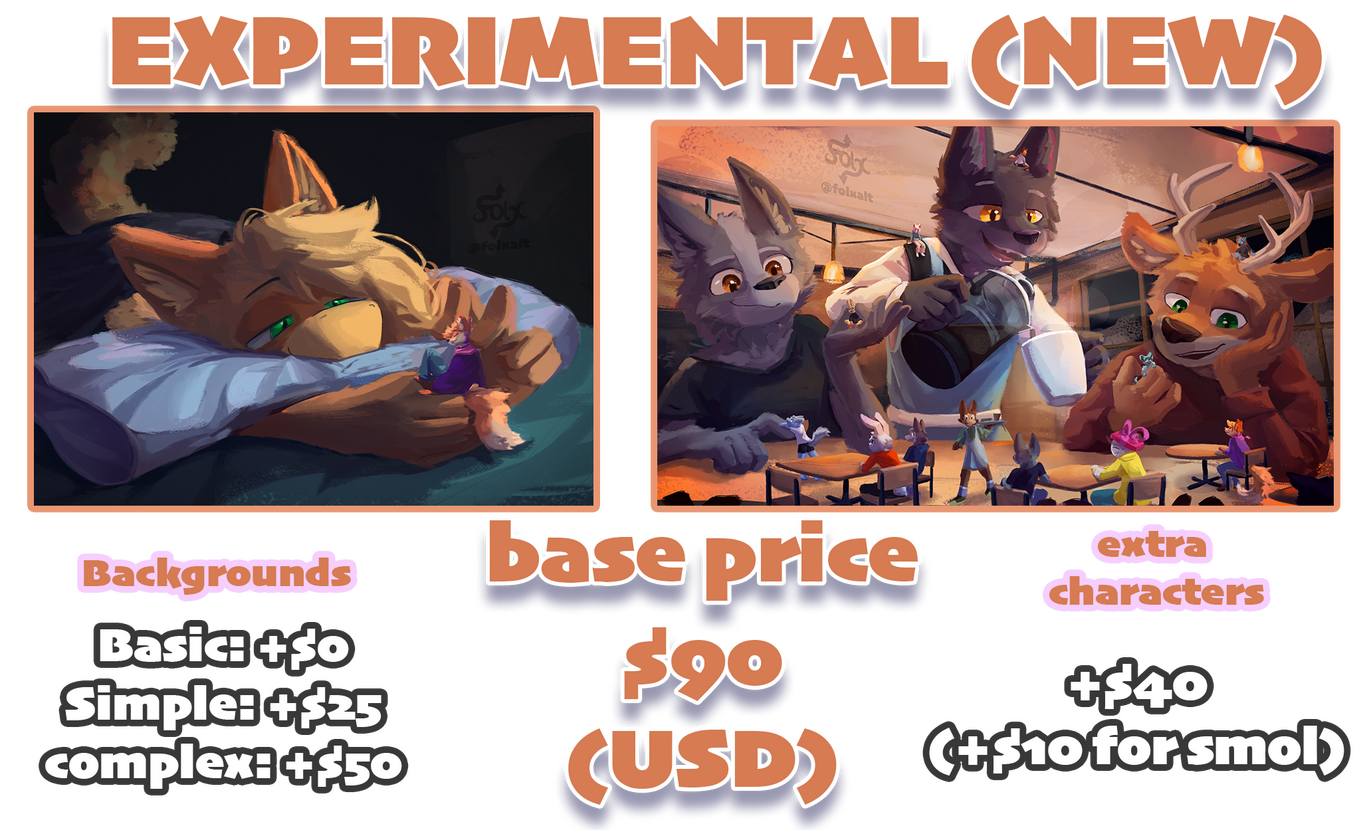 - For Basic, Full or Experimental commissions, we can do half of the payment beforehand and the other half upon completion.